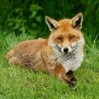 The image shows a red fox lying on the grass. It appears to be looking towards the camera with its ears perked up, which might suggest alertness or curiosity about the photographer's presence. The surrounding environment looks like a natural habitat with some vegetation visible around the fox.