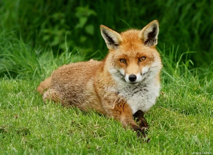На снимке изображена красная лиса, лежащая на траве. Похоже, что он смотрит в сторону камеры с поднятыми ушами, что может указывать на бдительность или любопытство в отношении присутствия фотографа. Окружающая среда выглядит как естественная среда обитания с некоторой растительностью, видимой вокруг лисы.