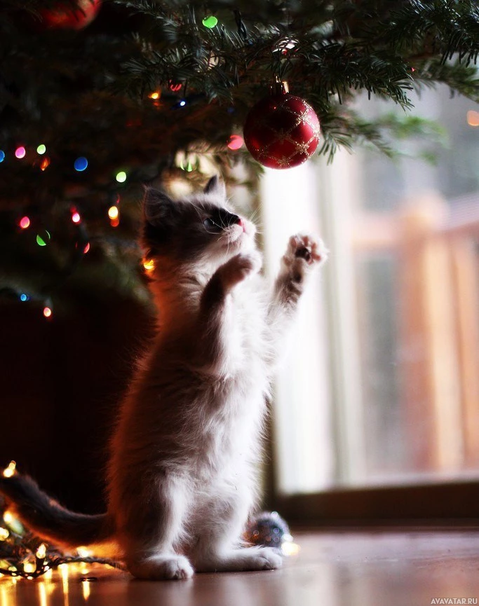 a Christmas tree adorned with lights and ornaments, including what seems to be a red ball. There is also a string of