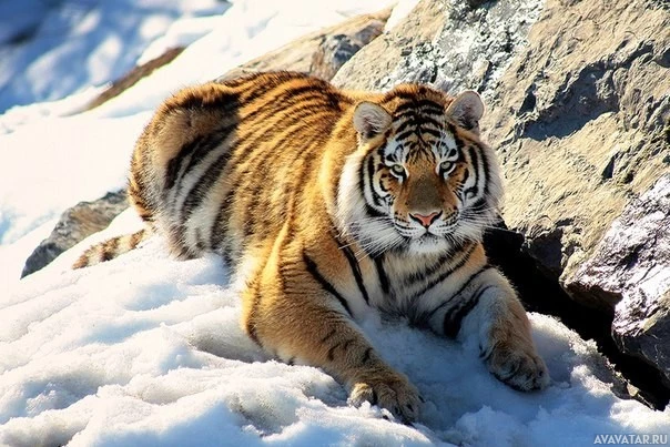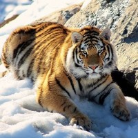 a cold environment that has experienced some melting snow, as indicated by the partially thawed surface under the tiger.