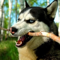 a forested area with trees around. The dog appears to be holding a stick or twig in its mouth and is looking directly at the camera. It has striking
