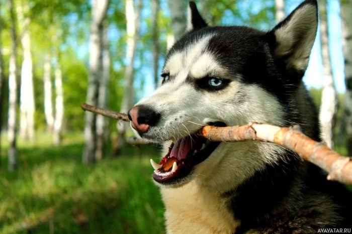 The image features a dog, specifically a Siberian Husky, standing in