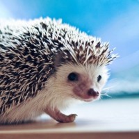 a small hedgehog (also known as a hoglet or baby hedgehog) sitting on what appears to be a table. It has characteristic spines along its back, which are used for protection against predators and other