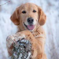 a tree stump or a piece of wood. The setting suggests it could be during winter or