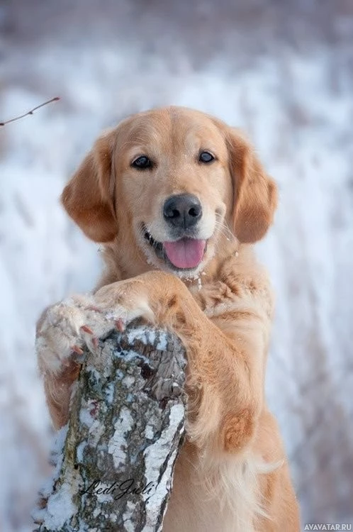 The image features a Labrador dog standing outdoors on what appears to be