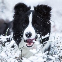 white coat and black and tan markings, commonly referred to as a Collie breed. The dog appears to be enjoying