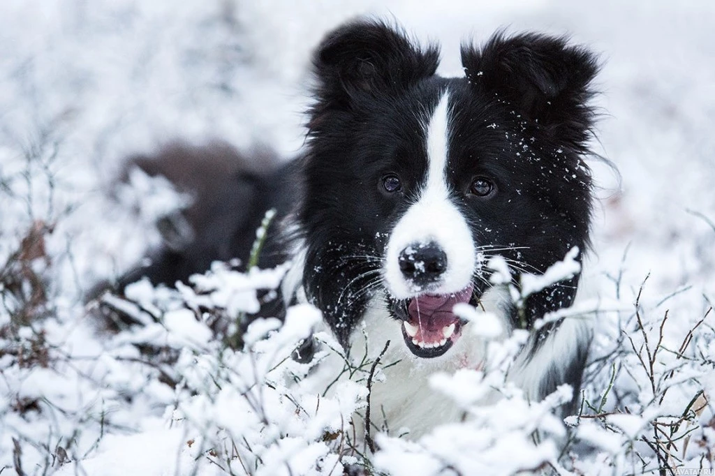the snowy conditions, likely experiencing the sensation of freshly fallen snow on its fur and nose. It's smiling or panting slightly, which indicates it might be feeling cold but is content in this