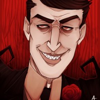 dark hair with red highlights, and a somewhat manic expression on his face. He has prominent