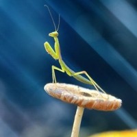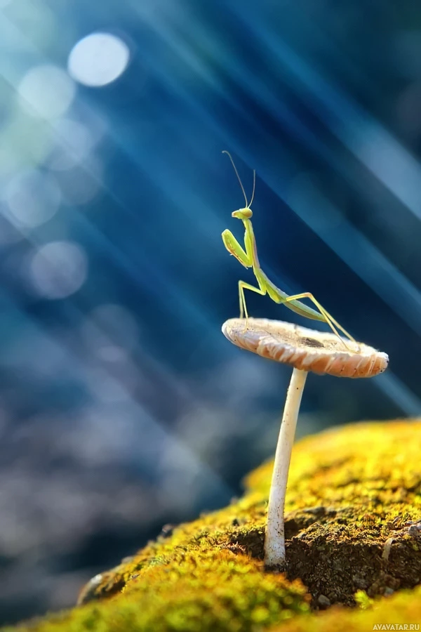 a small insect, likely a mantis or a praying mantis, perched on the top of a mushroom. The background is blurred with what appears to be a bright