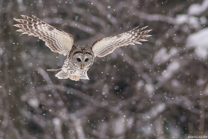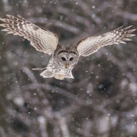 The image shows a bird, specifically an owl, flying through the air during what appears to be snowfall. The bird is captured in mid-flight with its wings outstretched and head turned slightly towards the viewer. It's