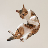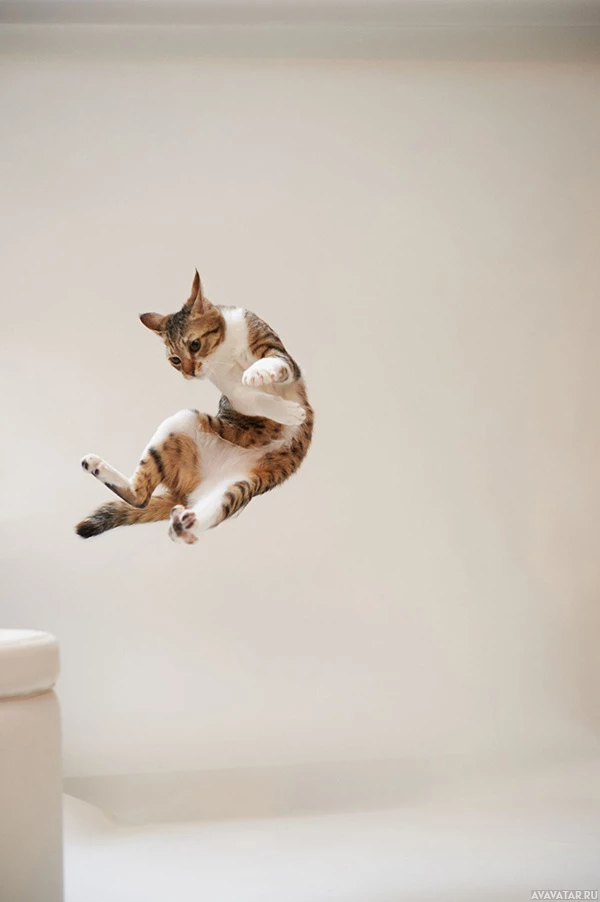 The image features a cat captured in mid-air, as if it's jumping or leaping off a surface. The cat appears to be a typical housecat with