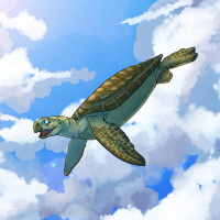 На снимке изображена анимированная черепаха, летящая по голубому небу с белыми облаками. Похоже, что он находится в середине полета, возможно, как часть его естественной способности плавать или как изображено в анимации.