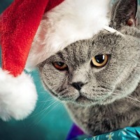 На картинке изображен серый кот в шляпе Санта. Этот праздничный аксессуар предполагает, что фотография, вероятно, предназначена для праздничного сезона, особенно в рождественское время.
