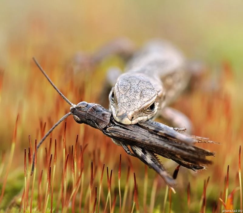 The image features a lizard (likely a grasshopper eater) interacting with another insect. The lizard is positioned on the left side of the frame, appearing alert and possibly ready to take action against its prey. On the right side, there's an insect that seems to be a grasshopper, which is common prey for such lizards. The background appears to be