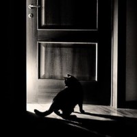 an open door. The room appears to be dimly lit, with the light coming from outside creating shadows and silhouette-like shapes. The cat is looking out through the doorway, and its reflection can be seen in the glass, suggesting that there might be a mirror or reflective surface on the other side of the door. There's no text visible in this image, and it doesn't contain any