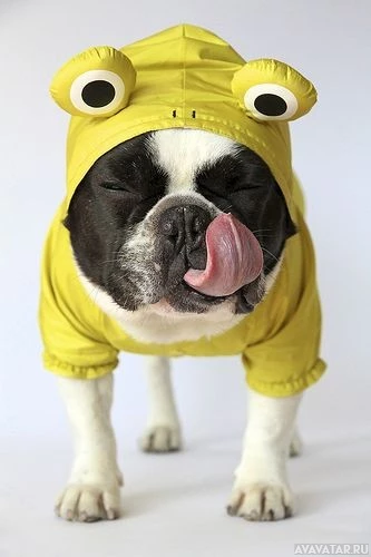 a French Bulldog due to its facial features and body shape. It's licking its lips as if it is enjoying the rain or is anticipating something tasty after posing for the photo.