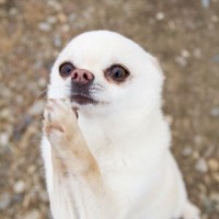 a small dog, which appears to be a Chihuahua. It has a light-colored coat and is in mid-air with its paws raised as if it's either jumping or being lifted off the ground by someone not visible in the frame. The background is quite nondescript, suggesting