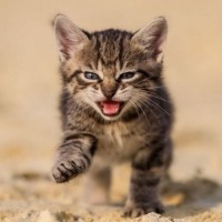 sandy ground or in a dirt area, as indicated by the textures visible under the kitten's feet. The kitten is captured mid-motion, giving an impression of it running or walking quickly. It seems curious and alert, which is