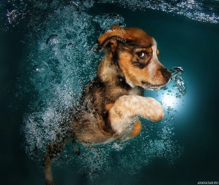 swimming in water. The dog appears to be enjoying itself, and its eyes are open wide, giving it a surprised or playful expression. There are bubbles around the dog's body, indicating that it is actively moving through the water.