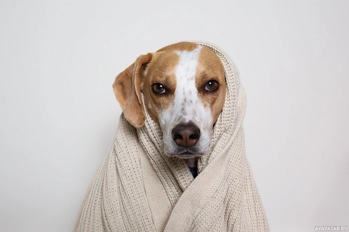The image shows a dog wrapped in what appears to be a blanket or shawl. The dog has a white and brown coat, indicative of breeds such as a Beagle, Dachshund, or similar mix. It looks like the dog is being humored with