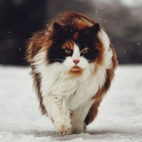 The image shows a fluffy, long-haired cat with striking facial markings. The cat appears to be walking through what looks like snow or wet ground, which suggests that the photo may have been taken during winter or in a cold climate.