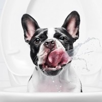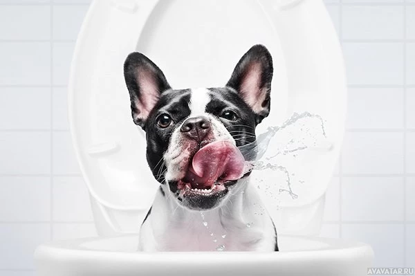 Картинка показывает бостонского терьера, сидящего перед туалетом, с широко открытым ртом, как будто он собирается пить из туалетной чаши. Есть вода, распыляющаяся из чаши и на собаку, создавая забавную ситуацию, когда собака, кажется, наслаждается водой.