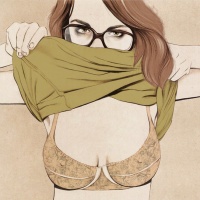 female figure. She is wearing a patterned bra and has her hands placed over her chest, holding up the garment slightly. Her gaze is directed downwards, and she appears to be looking at herself with