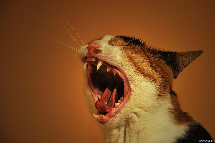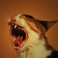 vocal cords in an expression that resembles a scream or yowl. The cat has a combination of orange, black, and