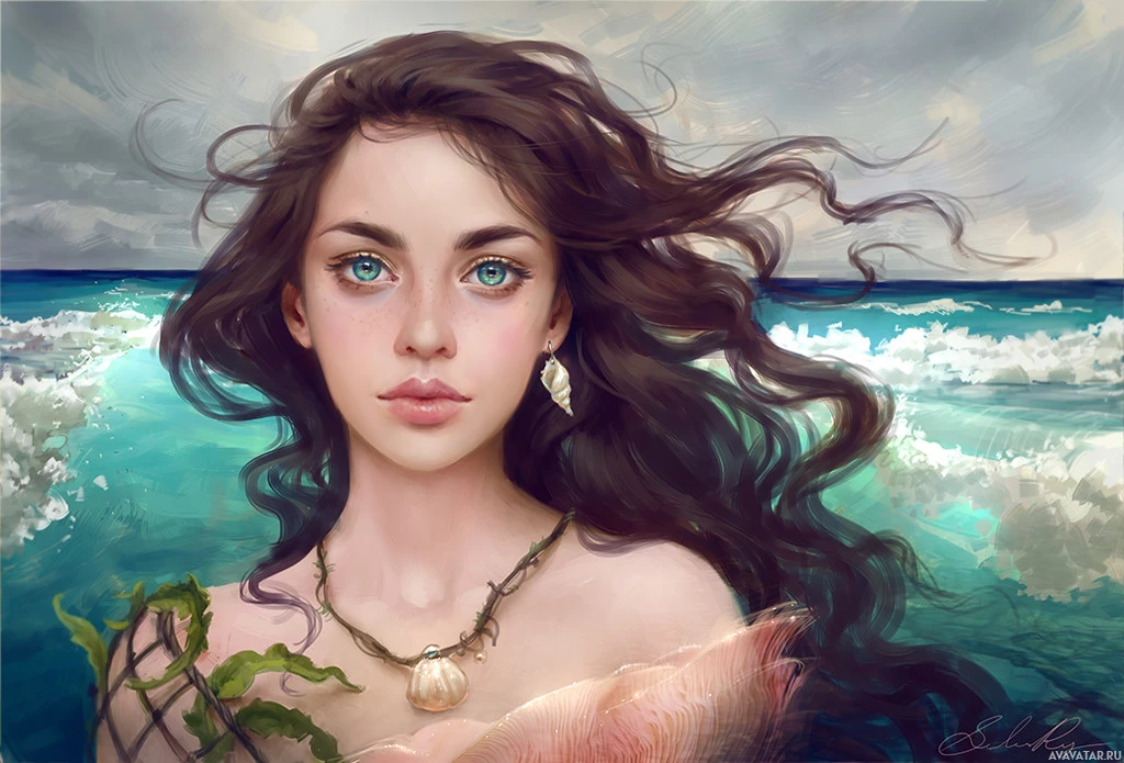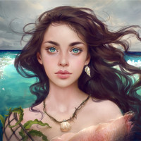 blue eyes that are accentuated by her makeup. Her expression is neutral with a hint of serenity. The background suggests an oceanic setting with waves and sea foam, creating