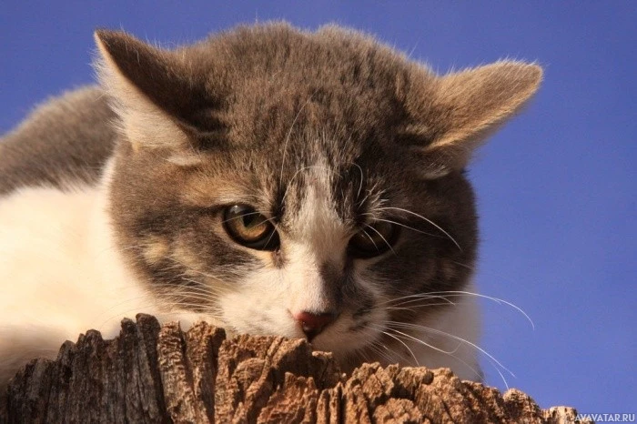 На картинке изображена кошка, сидящая на том, что кажется пнем дерева. У кошки полосатое пальто со смесью серого и белого меха. Его глаза открыты, и кажется, что он смотрит на что-то вдалеке или проявляет любопытство к своему окружению. Это ясный день с голубым небом, видимым позади кошки.