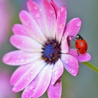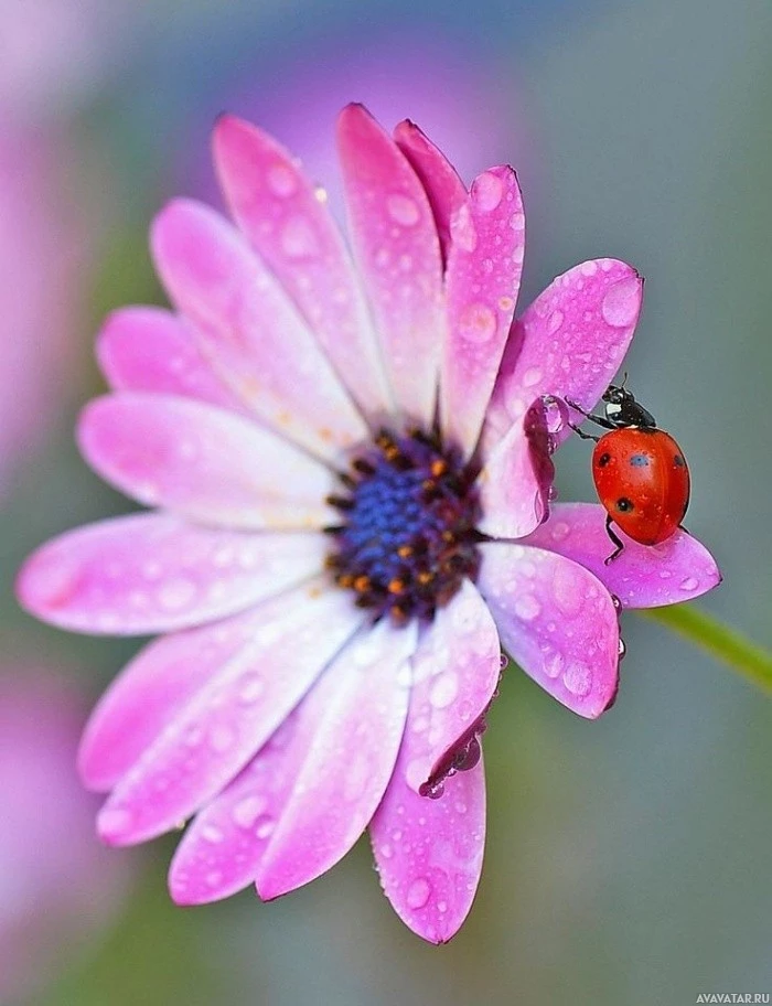 На картинке изображен божья коровка, которая является насекомым, сидящим на краю розового цветка. По-видимому, он находится в процессе посадки или ползания на лепестке цветка. Фон имеет мягкую зелень, которая создает впечатление садовой обстановки.