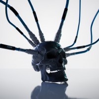 The image features a skull with multiple wires or cables connected to