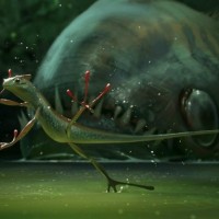 long legs and tentacles that appear to be moving or dancing. It seems to be swimming through the water. On the right side, there is a large fish or sea creature with a prominent eye, watching