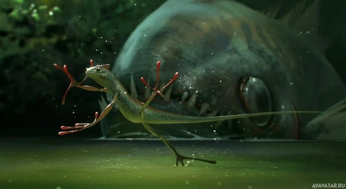 an underwater environment. On the left side, there is a red-skinned creature with multiple