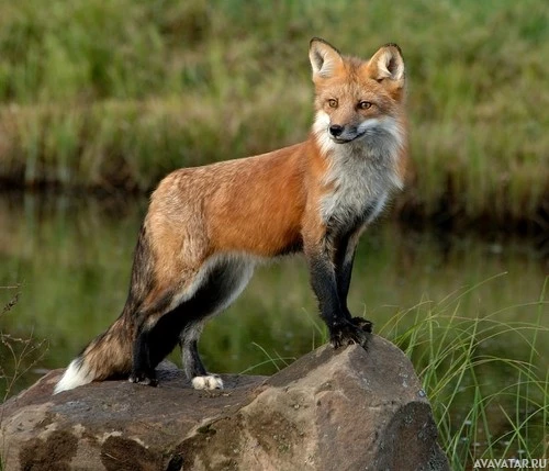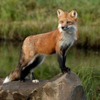 На картине изображена лиса, стоящая на том, что кажется скалами возле водоема. Лиса смотрит прямо вперед с закрытым ртом, и у нее видный красный мех. Фон предполагает естественную обстановку, которая может быть заповедником или естественной средой обитания для животного.