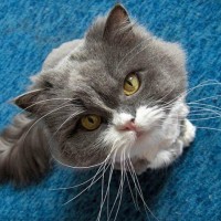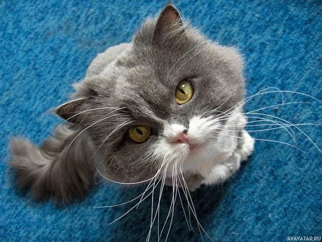 На снимке серая полосатая кошка смотрит прямо в камеру широко открытыми глазами с выражением легкого недоумения или любопытства на лице. У кошки белые отметины на морде, груди и лапах. Она сидит в помещении на полу, покрытом голубым ковром.