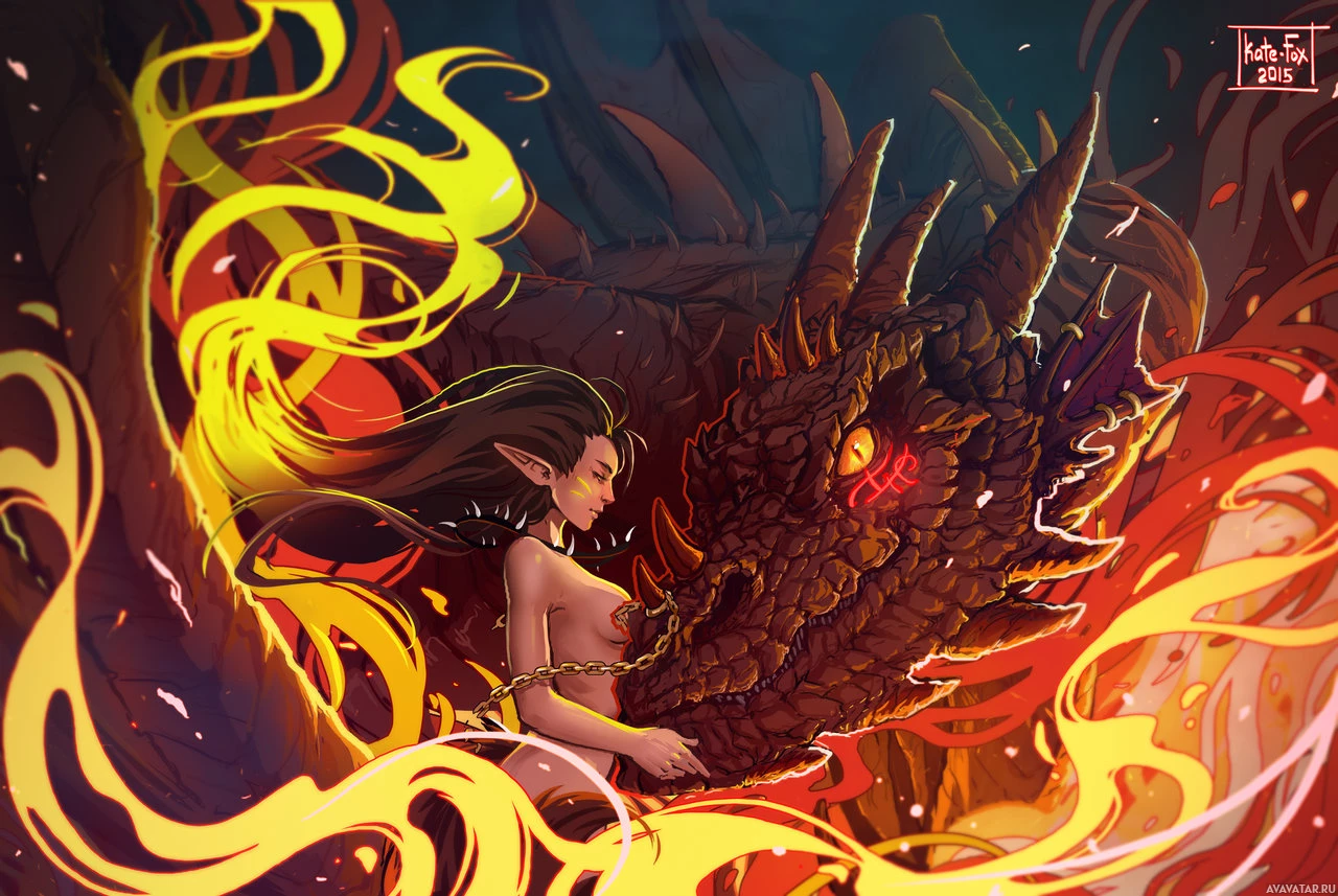 a fantasy scene involving an elf and a dragon. The elf, appearing on the left side of the frame, is engaged in