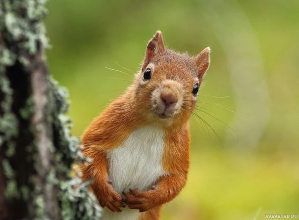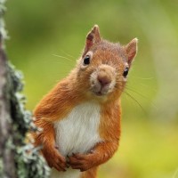 Картинка показывает красную белку, стоящую на том, что кажется краем ветви дерева. Животное имеет белый живот и смотрит в сторону камеры с открытым ртом, как будто собирается съесть или осмотреть что-то перед собой. Фон размыт, но предполагает естественную наружную обстановку с зеленой листвой.