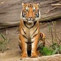 The image shows a tiger. The tiger appears to be sitting on the ground, possibly on a patch of dirt or grass with some plants nearby. It is looking directly at the camera and seems calm and attentive. The setting suggests it could be in a natural habitat or a wildlife sanctuary.