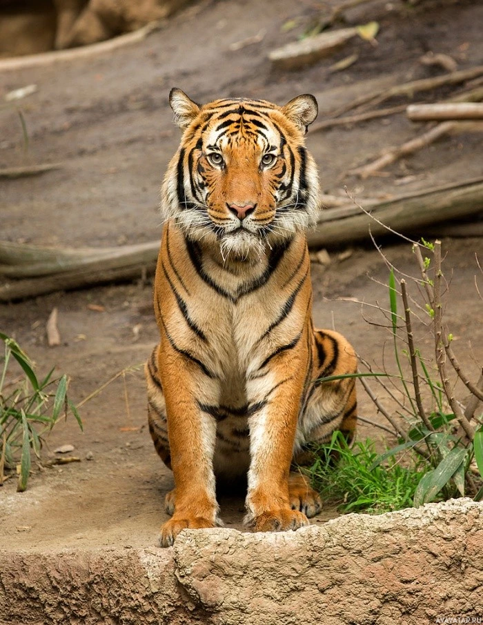 На фотографии изображен тигр. Тигр, кажется, сидит на земле, возможно, на участке грязи или травы с некоторыми растениями поблизости. Он смотрит прямо в камеру и кажется спокойным и внимательным. Расположение предполагает, что он может быть в естественной среде обитания или заповеднике дикой природы.