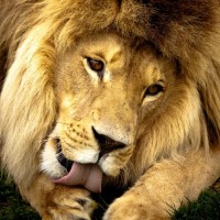 a common behavior among cats and other felines for self-grooming. The lion's fur looks well-maintained, suggesting that it might be in a safe and comfortable environment.