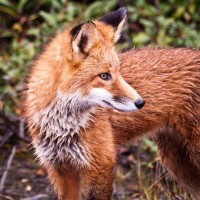 In the picture, there is a fox with its fur appearing wet and muddy, likely from rain or having been in water. The fox has a reddish-brown coat and is standing on what looks like a rocky terrain, possibly in