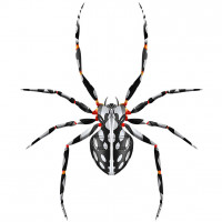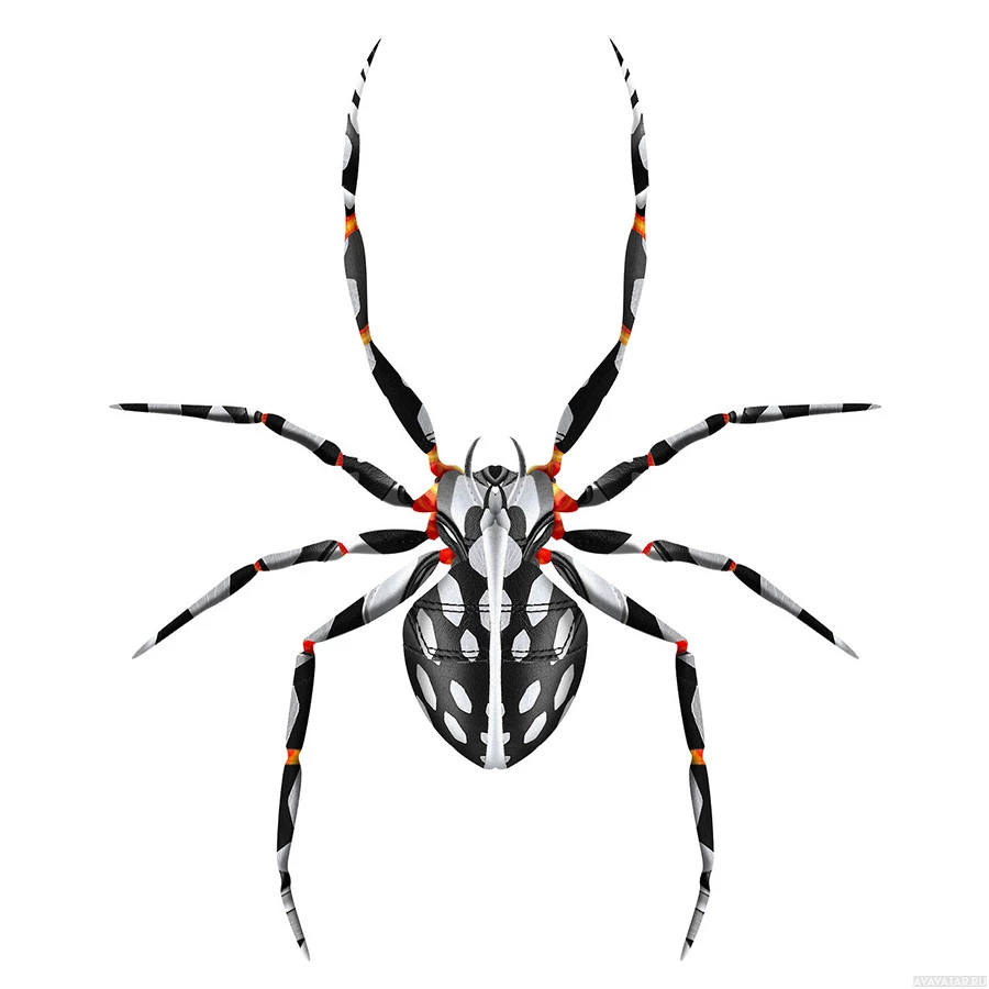 The image shows a highly stylized depiction of a spider. It has been designed with intricate detailing, including patterns on its body and legs that are not typically seen in natural spiders. The design includes elements such as metallic or reflective surfaces that give