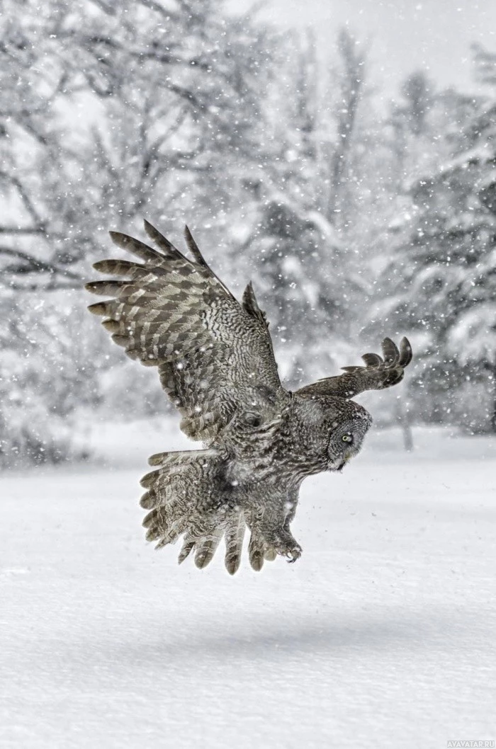 На снимке изображена снежная сова в полете. Снежные совы известны своим большим размахом крыльев и отличительными узорами оперения, которые позволяют им сливаться с зимним ландшафтом, помогая им охотиться в течение дня.