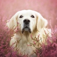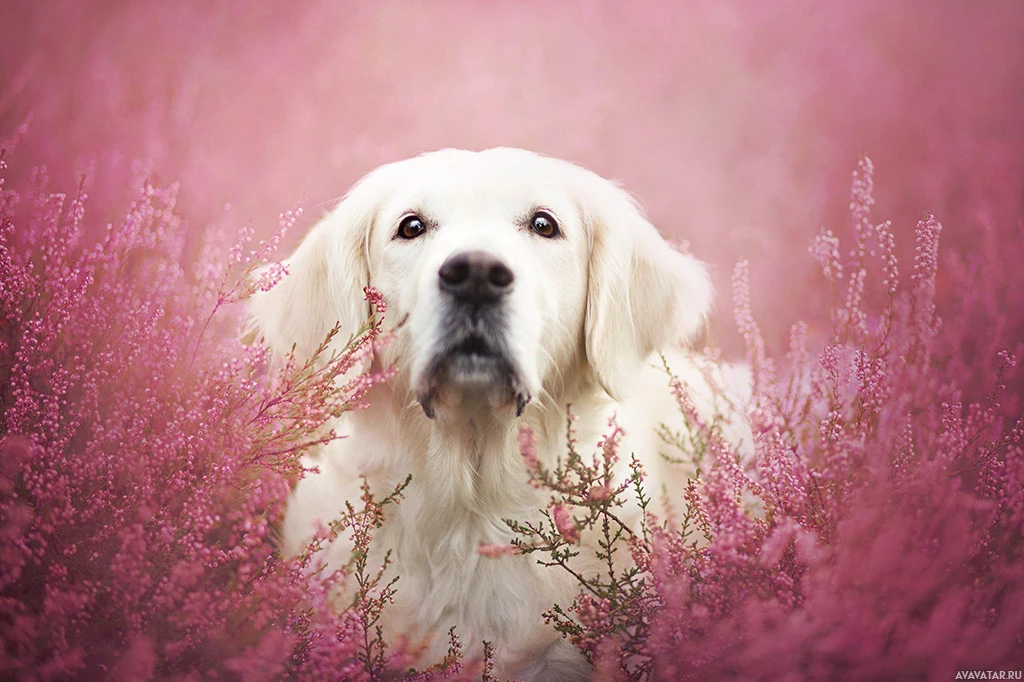 pink flowers, possibly wildflowers, which create a soft and pastel-colored environment that contrasts with the dog's coat color. This type of image might be used for pet photography or to showcase