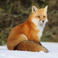 На снимке изображена красная лиса, сидящая на земле с обернутым вокруг себя хвостом. Фон предполагает, что он находится в лесной среде, вероятно, в течение зимнего сезона, учитывая наличие снега на земле. Лиса выглядит спокойной и смотрит прямо в камеру.