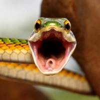 venomous viper often referred to as a pit viper due to the presence of heat-sensitive pits that detect infrared radiation. The snake has its mouth open and appears to be hissing or vocalizing. It's important to note that this behavior can indicate aggression, fear, or communication with other snakes. The snake is not alone in the image; it seems to be on a leafy branch or plant, which is likely part of its