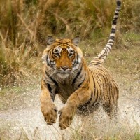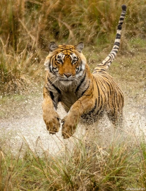 На картине изображен тигр, бегущий через водоем, такой как река или ручей. От земли и от движения тигра исходит брызг воды. Место действия кажется естественным, возможно, заповедник или национальный парк.
