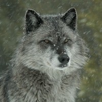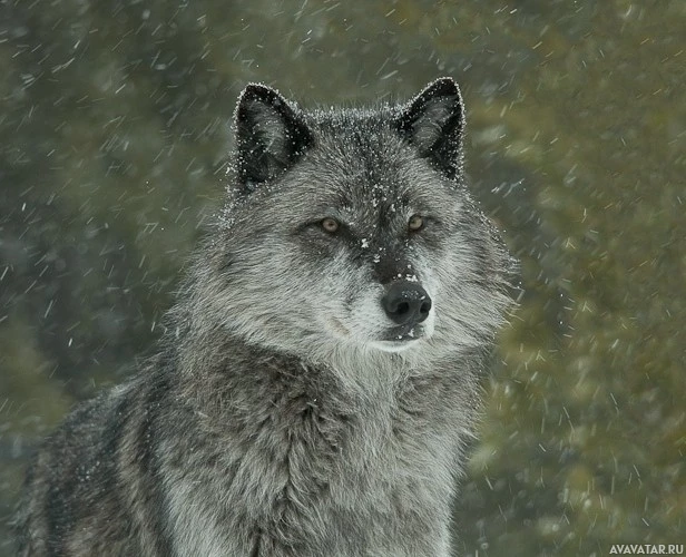 snow on the ground and possibly in the air, given the wet appearance of the wolf's fur. The wolf is facing the camera directly with