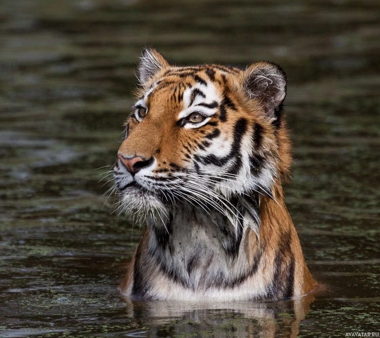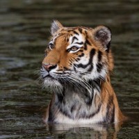 The image shows a young tiger swimming in